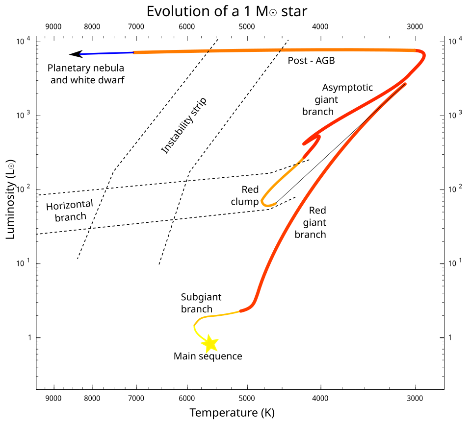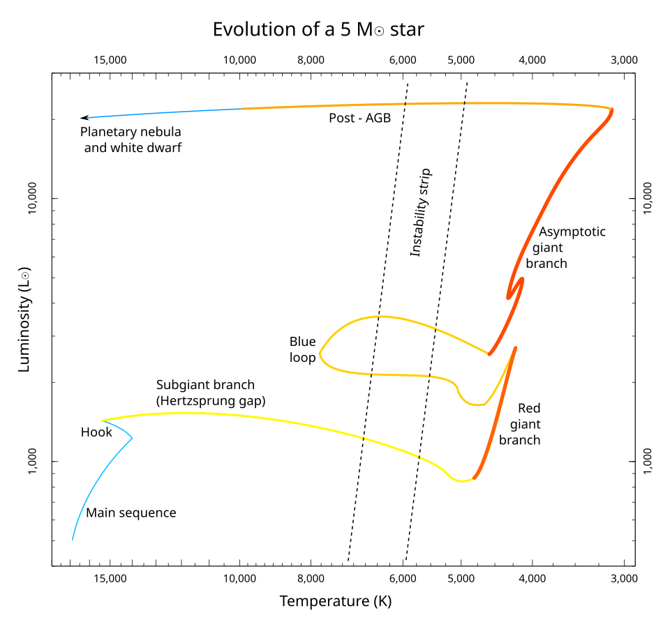 AGB (Asymptotic Giant Branch) After fusing to carbon and oxygen it triggers a hydrogen and helium shell burning. Core contracts. This repeats the same process of being convective and expanding and releasing more energy while at the same temperature. This chaos creates pulsations to which the star blows away its outer layers to become a white dwarf.