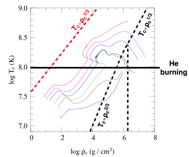 Now let us focus on the temperature density plot. The same story applies here. When the star is born it is at one particular place on the plot. When it evolves off the main sequence it moves up and to the right in the non-degenerate non-relativistic regime.