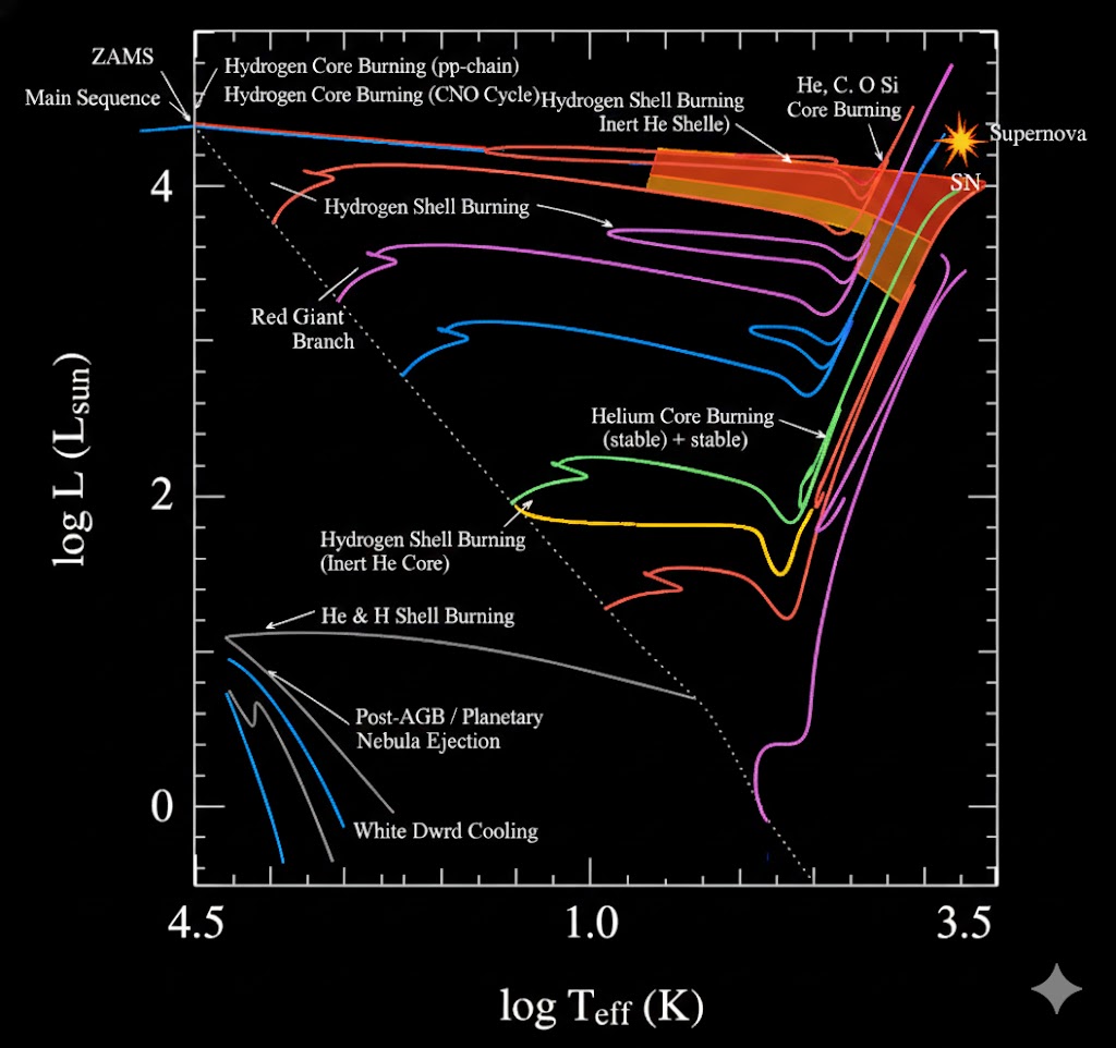 Massive Stars: \(>8 M_\odot\): Now let us take a look at big massive stars. The massive stars evolve initially similarly. They also have a sub giant branch and also have a red giant branch. However they never trigger helium flash because it never crosses the line of degeneracy. And fuses helium no problems. This creates that blue loop.